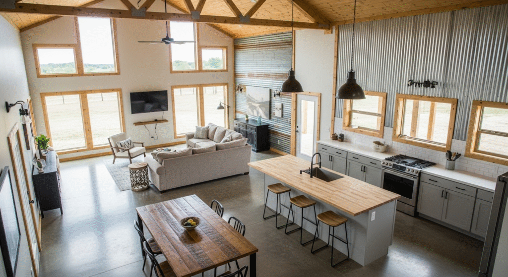 Designing a barndominium on a budget requires creativity and efficiency. Open floor plans are a smart choice because they maximize space and reduce the need for extra walls and labor. Large, flexible areas can serve multiple purposes, like combining the living room, dining, and kitchen into one central space.