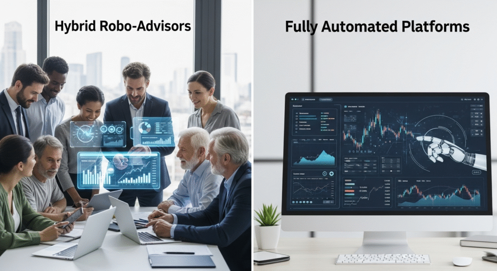 Fully automated platforms are the most common type of robo advisor investing. These platforms use algorithms to manage your investments entirely without human intervention. When you start, you answer questions about your financial goals, risk tolerance, and investment horizon. The platform then creates a personalized portfolio and handles everything automatically, including rebalancing, tax-loss harvesting, and monitoring market conditions. Fully automated robo-advisors are ideal for beginner investors or those who want a hands-off approach. They offer low fees and convenience because you do not need to meet with a financial advisor or actively manage your portfolio. Some popular examples of fully automated platforms include Betterment, Wealthfront, and SoFi Invest.