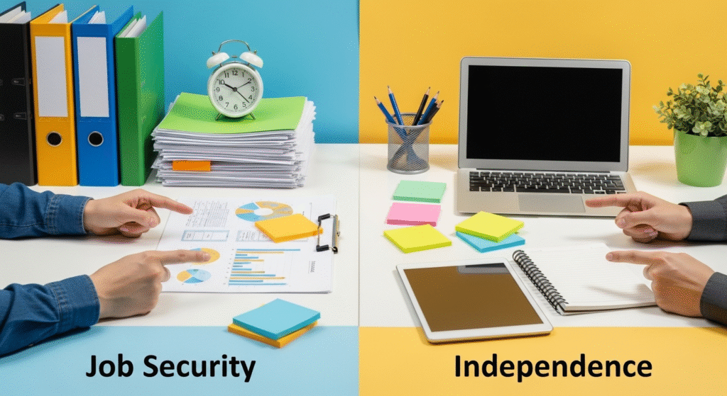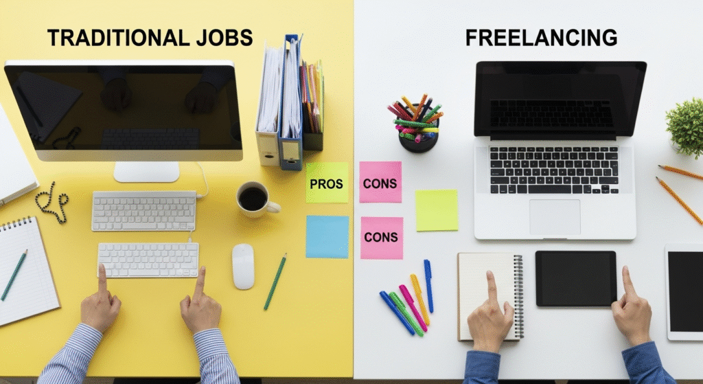 Traditional Jobs vs Freelancing also highlights the benefits of conventional employment. Traditional jobs provide stability, regular income, and perks like health insurance, retirement plans, and paid leave. Understanding the pros and cons of each option helps you make smart career choices that match your goals, lifestyle, and priorities.